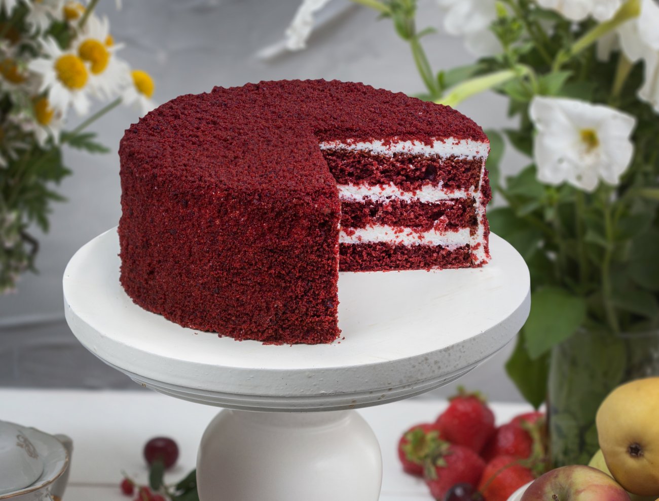 Торт "Красный бархат" 650гр Бисквит "Красный бархат" с кремом из взбитых сливок и творожного сыра с прослойкой из вишневого пюре -