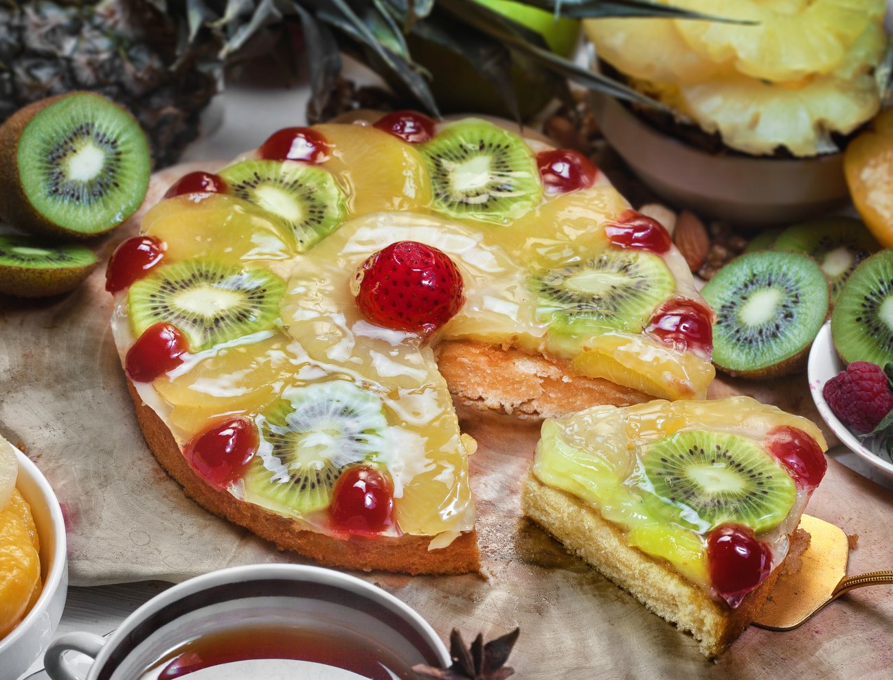Пирог Голландский тропический 600гр Нежный бисквит с начинкой из ананасов, киви, вишни и клубники, залитый сладким гелем -
